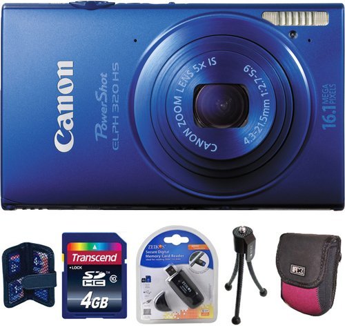 On Sale Canon PowerShot ELPH 320 HS Digital Camera (Blue) + Transcend 4 GB SDHC Class 10 Card, + Card Reader, Memory Card Wallet, Nice Fitted Case, and Table Tripod.